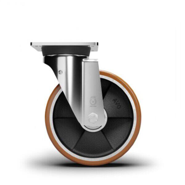 Ruota con rivestimento in Poliuretano AVOPRENE 91 Shore A e nucleo in ghisa meccanica verniciata color nero. Mozzo su cuscinetti a sfere schermati assemblati con distanziale centrale.