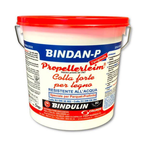 Bindan P Ã¨ una colla vinilica pura, priva di cariche e sostanze riempitive, resistente all’acqua e alle muffe. Senza solventi ne formaldeide, certificata EN/71 (assenza di sostanze nocive). Dopo l’essiccazione risulta perfettamente trasparente. Bindan P ha un’ottima resistenza al calore ed è certificata al watt 91>7,3 N/mm^2 e al creep test (tenuta al carico statico).