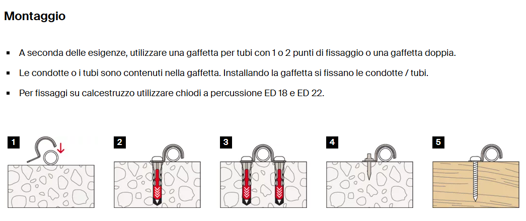 La gaffetta per tubi consente un fissaggio diretto con i chiodi a percussione ed è quindi, veloce e facile da installare