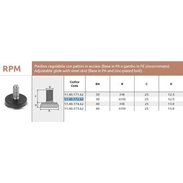 Piedino regolabile Ø40 con pattini in acciaio e perno M10