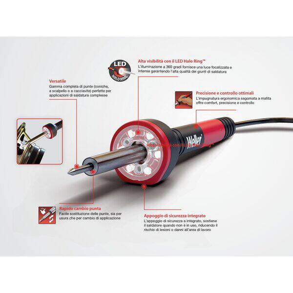 Salda con maestria e sicurezza con la stazione di saldatura Weller da 30 W con LED Halo Ring™. Dotato di illuminazione a 360 gradi, impugnatura ergonomica sagomata a matita, punte facili da cambiare e appoggio di sicurezza integrato, è il saldatore versatile e di alta qualità perfetto per tutte le esigenze di saldatura.