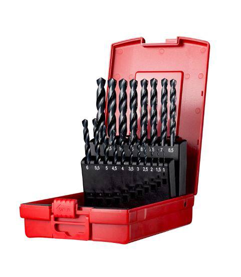Set di punte in confezione di plastica standard consistente in 19 lunghezza convenzionale punte con attacco cilindrico, A100 diametri 1.0 fino a 10.0mm in incrementi di 0.5mm, secondo DIN 338 standard con 118° nocciolo conico, HSS con finitura vaporizzata per 4xD foratura senza centraggio in acciaio.