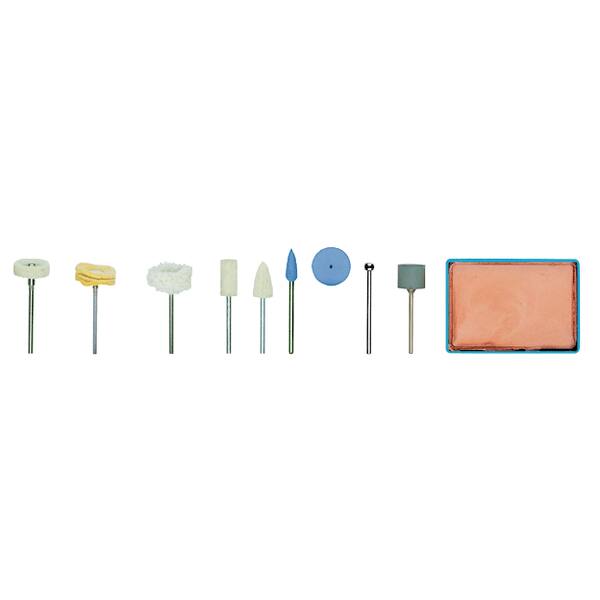 Per lucidare metallo, vetro, metalli preziosi, porcellana e plastica. Composto da 3 punte per lucidatura in feltro (a cilindro, cono e a ruota), 3 punte per lucidatura in silicone (a proiettile, cilindro e disco), disco per lucidatura in cotone, ruota per lucidatura in camoscio e pasta per lucidatura. Include albero da 2,35 x 44 mm.