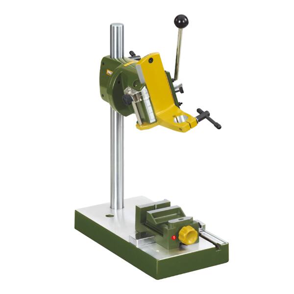 Avanzamento a cremagliera e pignone con molla di ritorno che consente un funzionamento senza sforzo e sensibile. Pratica scala di profondità di foratura con finecorsa regolabile (corsa massima 40 mm). Con collare standard da 20 mm per dispositivi di foratura e fresatura MICROMOT. Con colonna in acciaio cromato duro e solido (280 x 20 mm), capacità della gola (dalla colonna interna al centro dell'utensile) 140 mm.