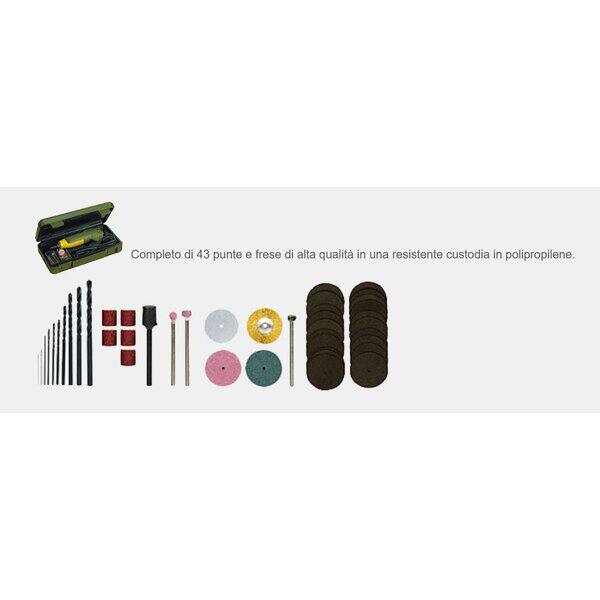 Completo di 43 punte e frese di alta qualità in una resistente custodia in polipropilene.