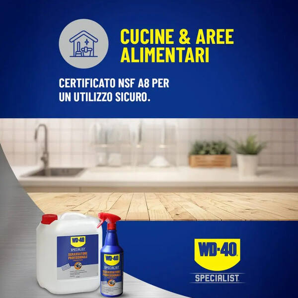 Lo Sgrassatore Professionale Concentrato WD-40 Specialist, grazie alla formula innovativa con tensioattivi ad alte prestazioni agisce in maniera veloce ed efficace, rimuovendo sporco ostinato, grasso e residui incrostati. Non abrasivo e sicuro su molteplici superfici. Compatibile con alluminio, seguendo le modalità d’uso. Formula registrata NSF A8.
